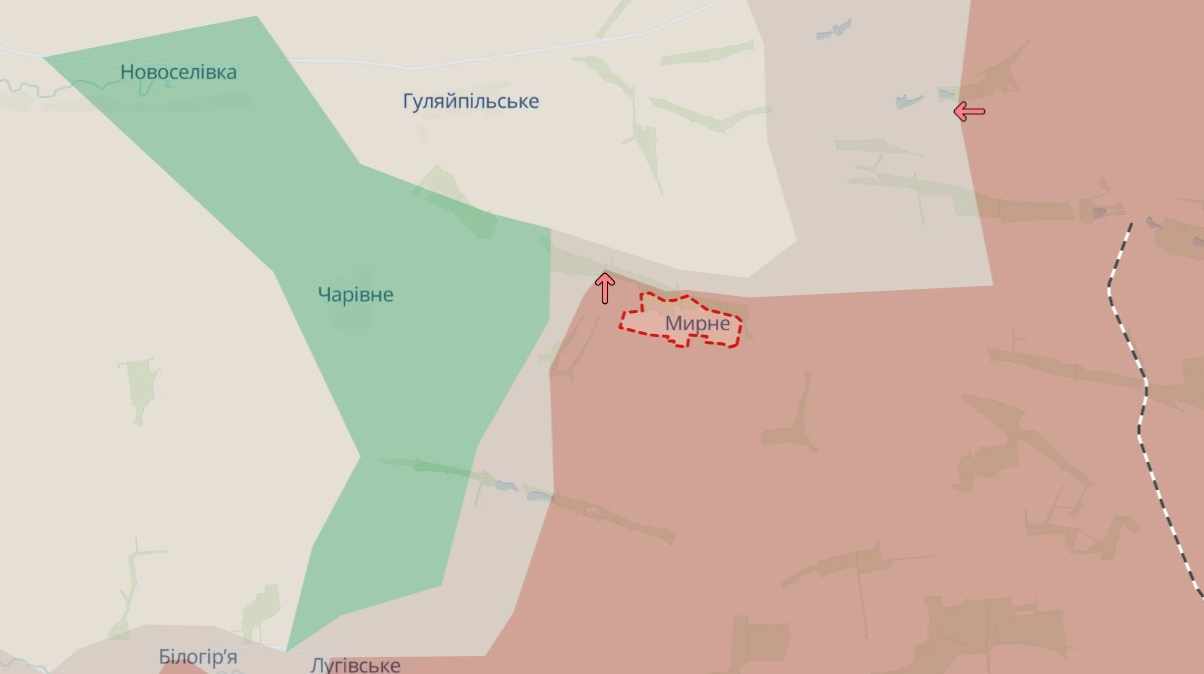 За даними DeepState, російські війська окупували село Мирне на Гуляйпільському напрямку.