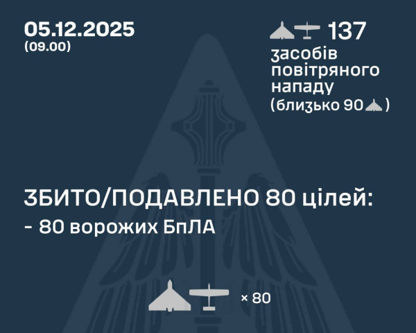 У ніч проти 5 грудня противник атакував Україну 137-ма ударними БпЛА типу Shahed, "Гербера" і безпілотниками інших типів, близько 90 із них - дрони Shahed.